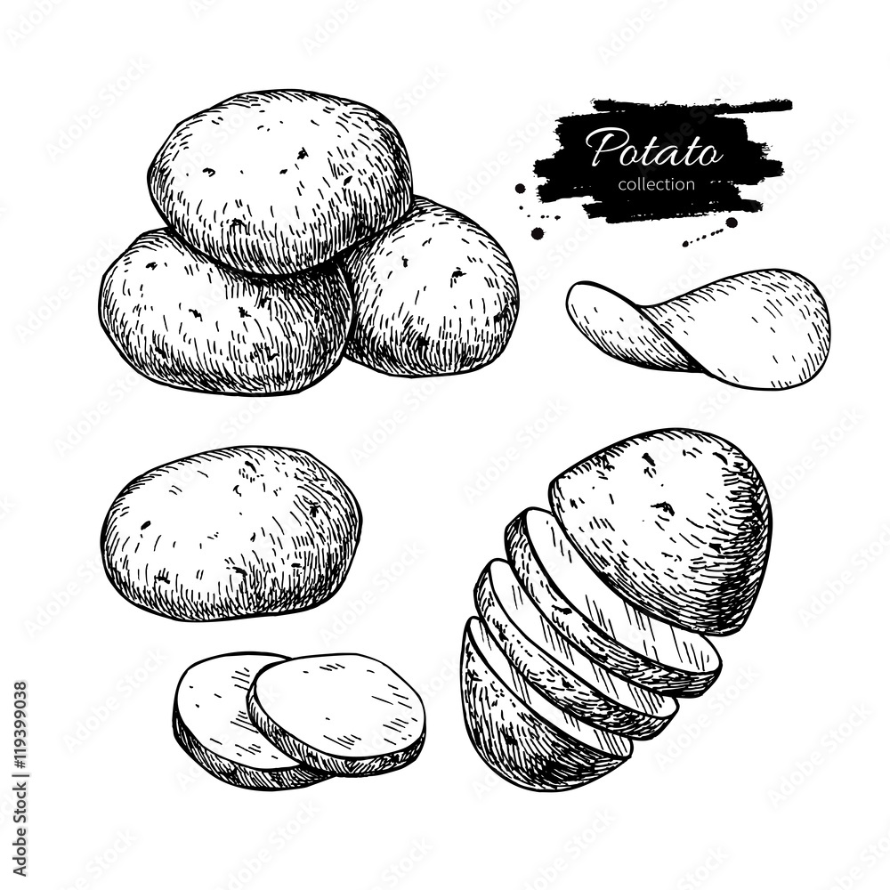 Vászonkép Potato drawing set. Vector Isolated potatoes heap, sliced pieces