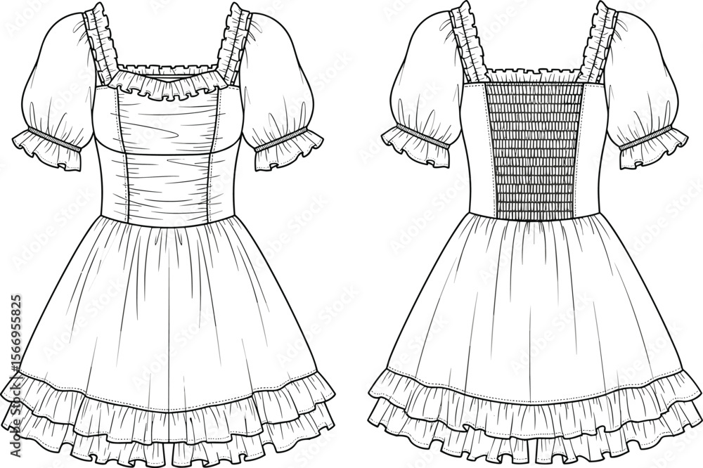 Vászonkép Puff sleeve dress flat sketch, ruffle hem smocked back, fashion technical drawin
