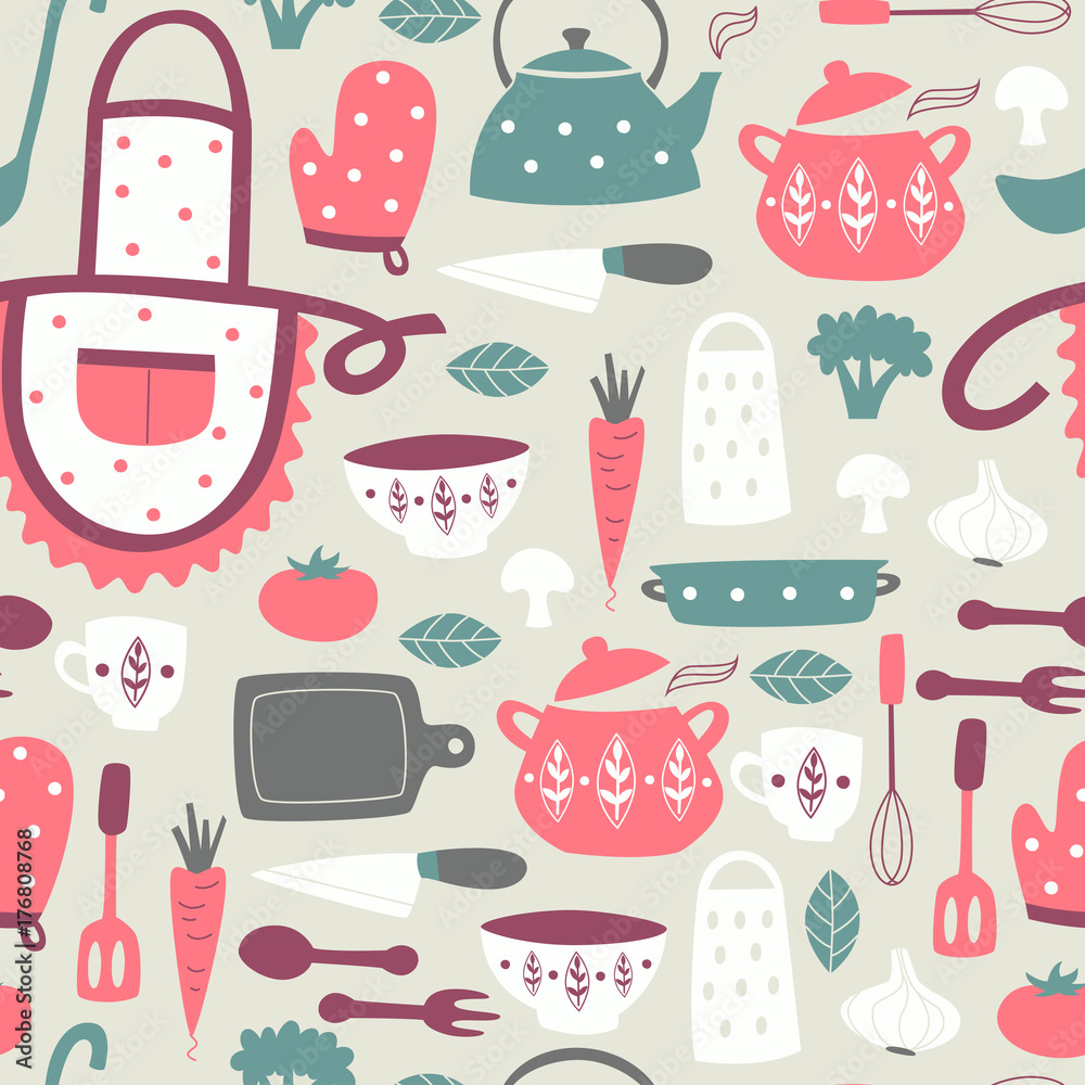 Vászonkép Cute Kitchen Vector Seamless Pattern.