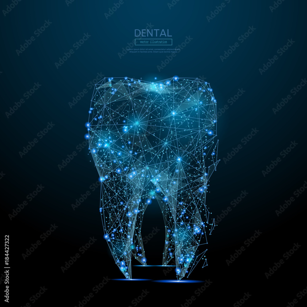 Vászonkép Abstract image of tooth low poly wireframe in the form of a starry sky or space, consisting of points, lines, and shapes in the form of planets, stars and the universe