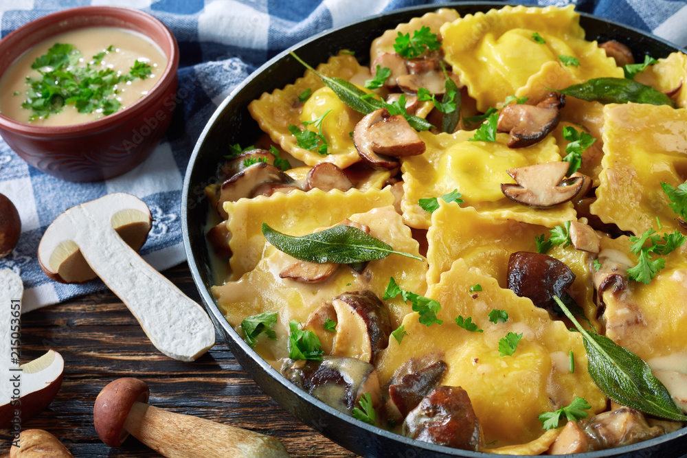Vászonkép homemade ravioli in garlic mushrooms sauce