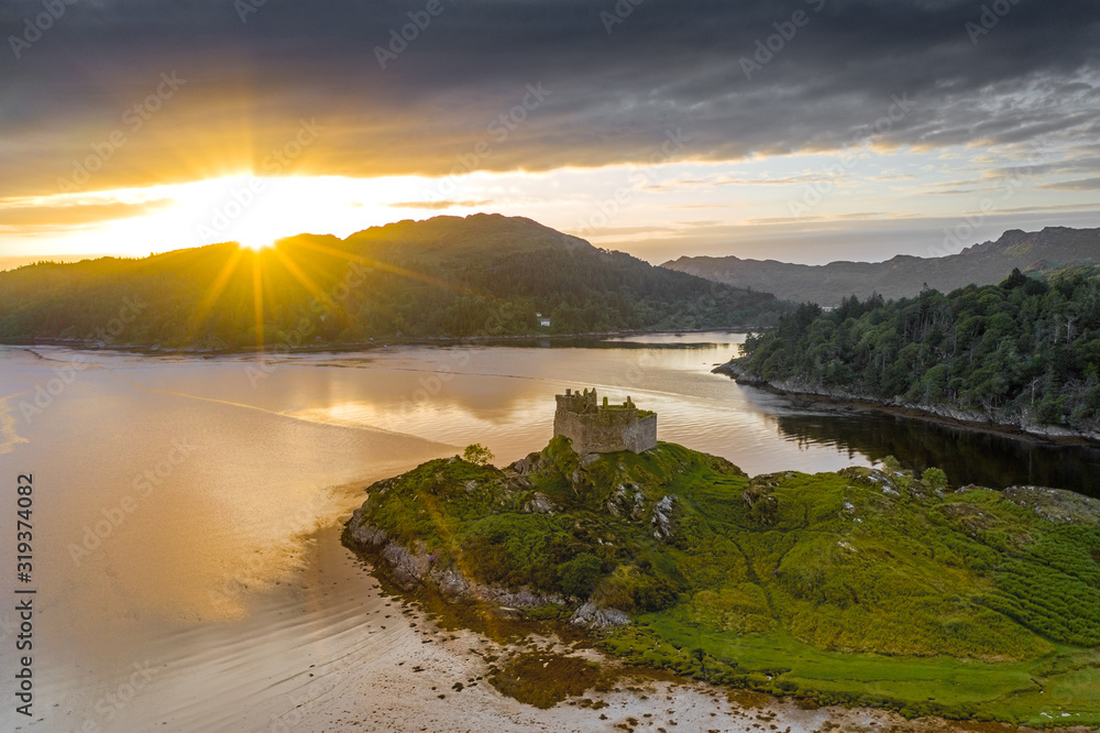 Vászonkép Aerial drone shot of Castle Tioram, Scottish Highlands.