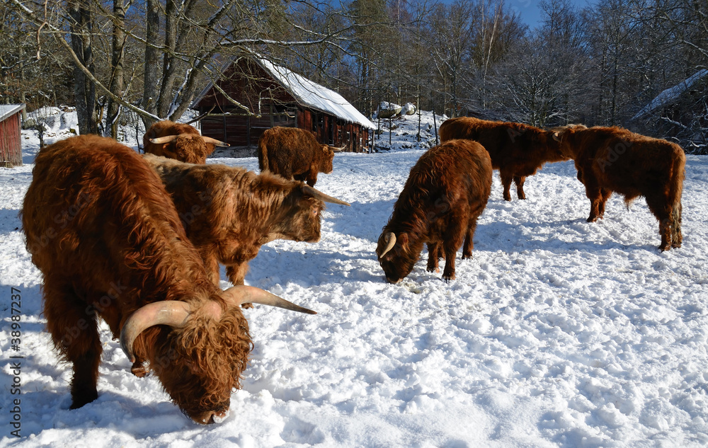 Vászonkép The flock of highland cattle in winter season