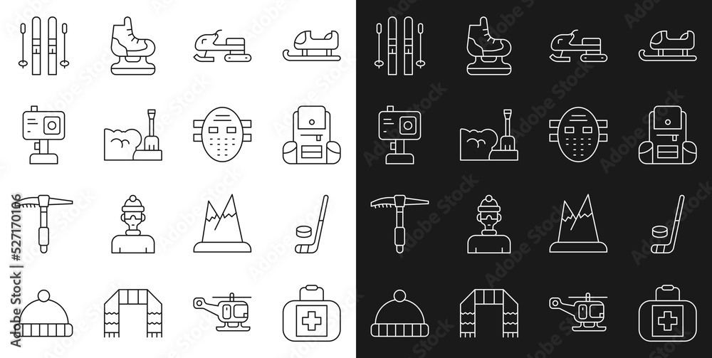 Vászonkép Set line First aid kit, Ice hockey stick and puck, Hiking backpack, Snowmobile, Shovel snowdrift, Action camera, Ski sticks and Hockey mask icon