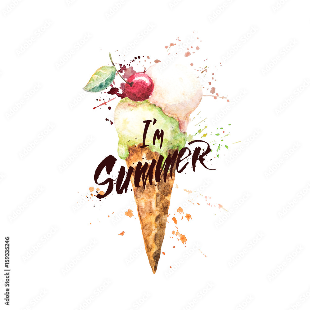 Fototapeta Watercolor ice cream cone with paint splashes and with hand-written lettering I'm summer